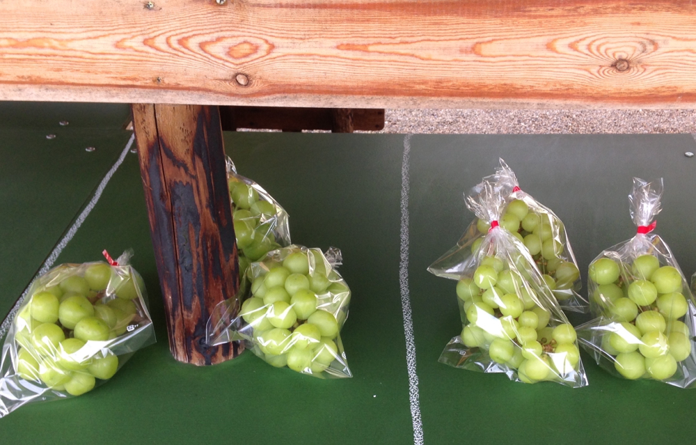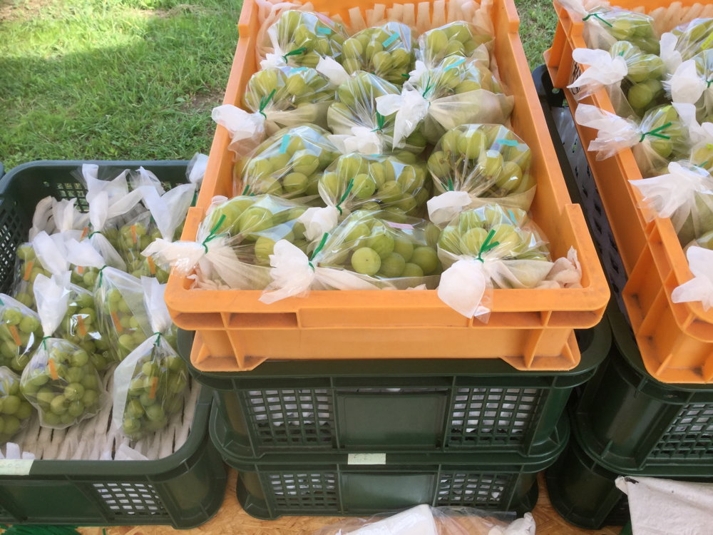 今も直売所では一番人気で、収穫はまだまだ早い頃から、下手すると桃の時期からシャインマスカットはいつ収穫ですか?