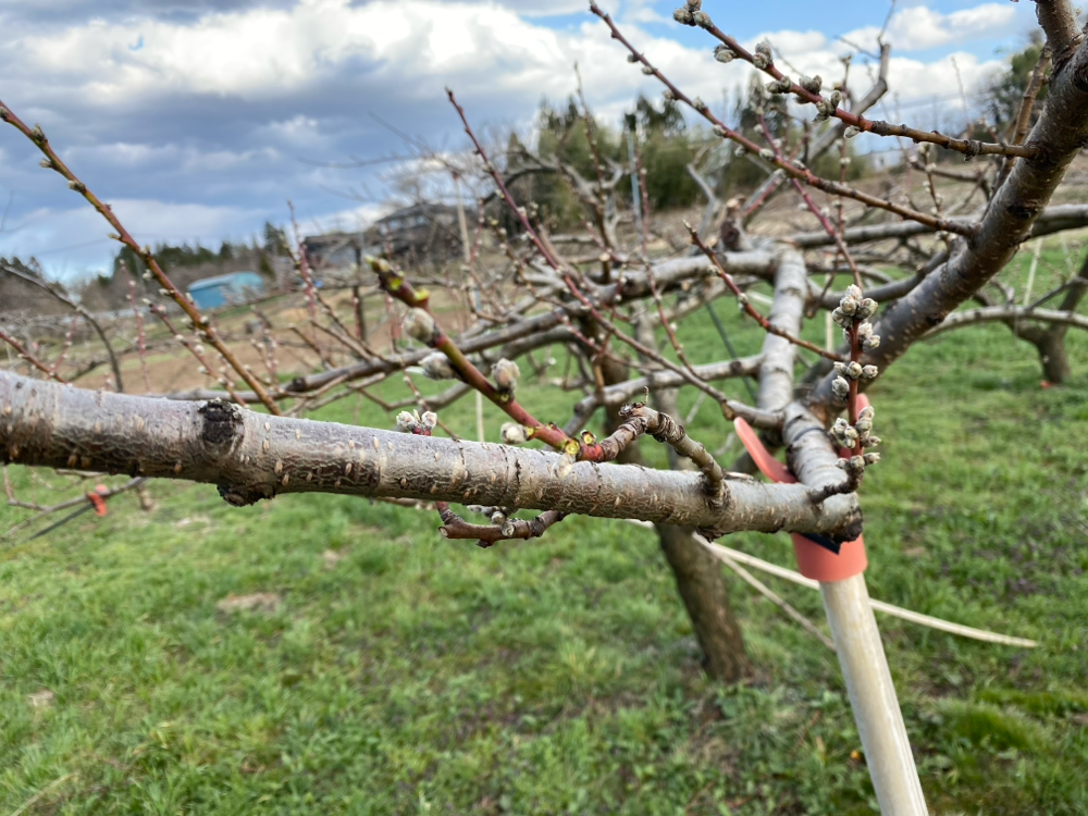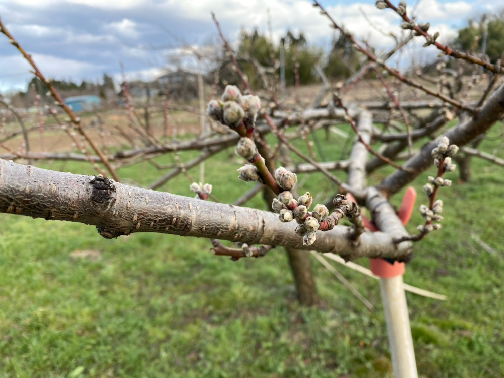 今の時期は季節の進み具合に気をつけて、低温にあっても実が残るように考えながら摘蕾をしていきます。